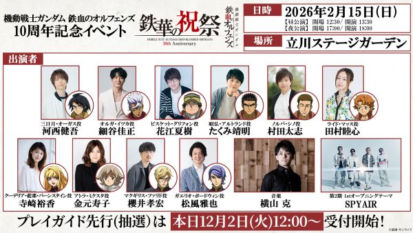 2026年2月15日(日)に立川ステージガーデンにて行われる、『機動戦士ガンダム 鉄血のオルフェンズ』10周年記念プロジェクトのフィナーレイベント「機動戦士ガンダム 鉄血のオルフェンズ 10周年記念イベント -鉄華の祝祭-」のチケットプレイガイド先行(抽選)が本日12月2日(火)より受付開始!